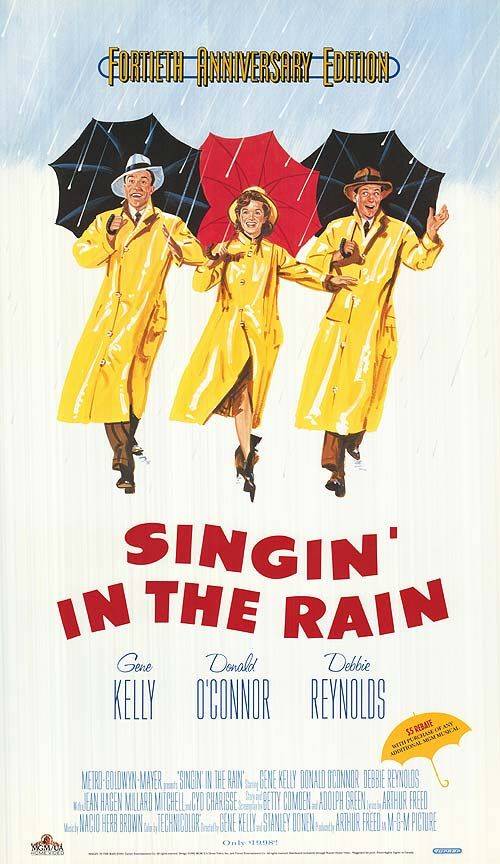De periode waarin men overging van de stomme naar de gesproken film is het interessante uitgangspunt van deze beroemde musical en leent zich, door alle hindernissen die destijds moesten worden genomen, bij uitstek voor een amusementsfilm als deze. Daarnaast is het een slimme zet om een musical middenin de showbizzwereld te situeren en zo een musical in een musical te creeëren, anders komen de liedjes en al dat gedans zo uit het niets vallen. De film speelt zich af in 1927 en Don Lockwood (Gene Kelly) is een ster van de stomme film. Maar in navolging van "The Jazz singer" besluit men dat de film waar op dat moment aan gewerkt wordt, tot musical bewerkt gaat worden. De tegenspeelster van Don, Lina heeft echter een afschuwelijk New Yorks accent en haar partijen moeten daarom worden ingezongen door de onbekende Kathy. Als Don vervolgens verliefd wordt op Kelly brengt hij daarmee zijn carriere in gevaar. Ik ben echt geen musicalliefhebber, maar van deze aanstekelijke film kan ik, ondanks de regen in het beroemde fragment, onmogelijk chagerijnig worden.